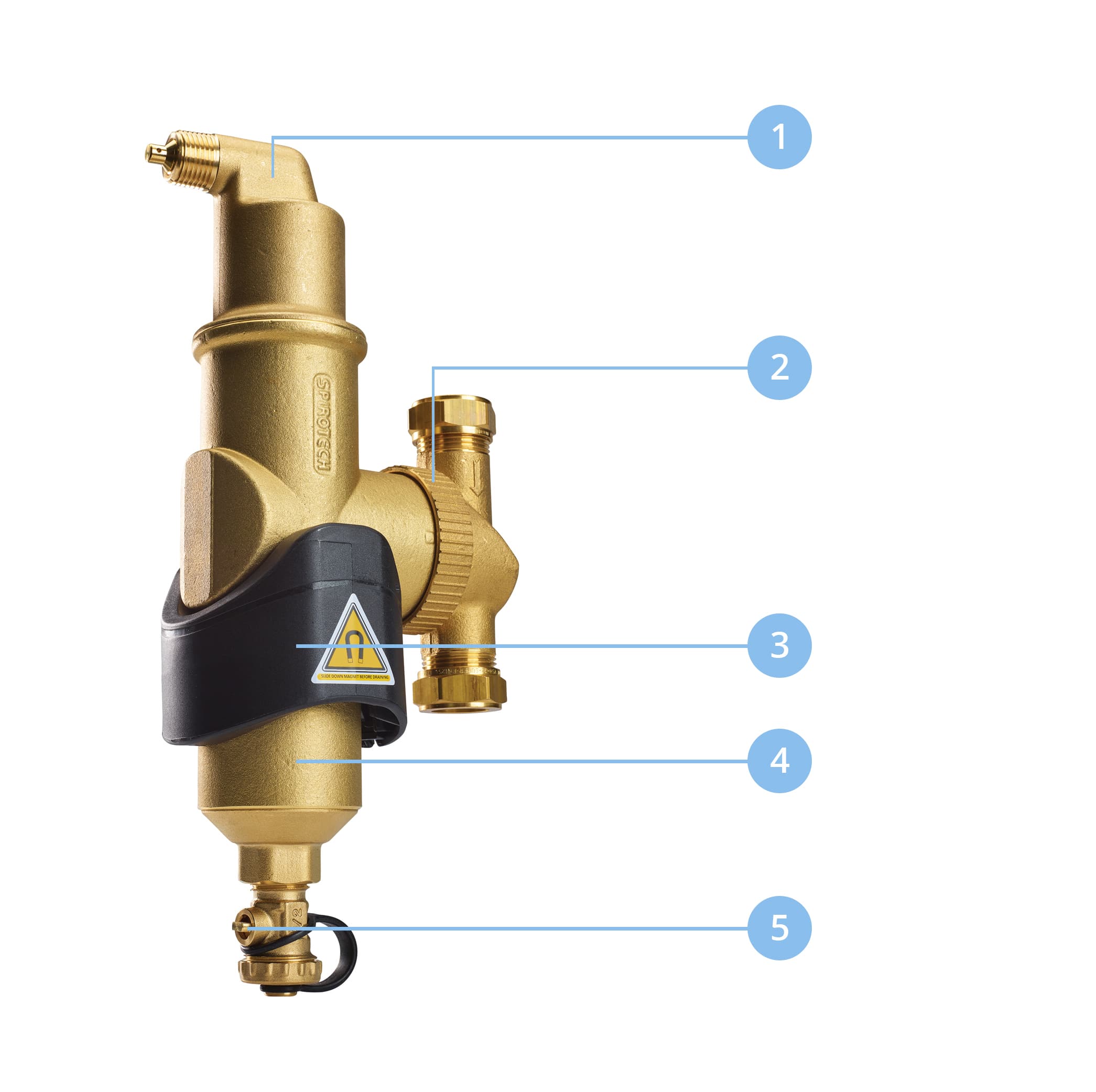 - Utbåsningsventil för att avlägsna avskild smuts.