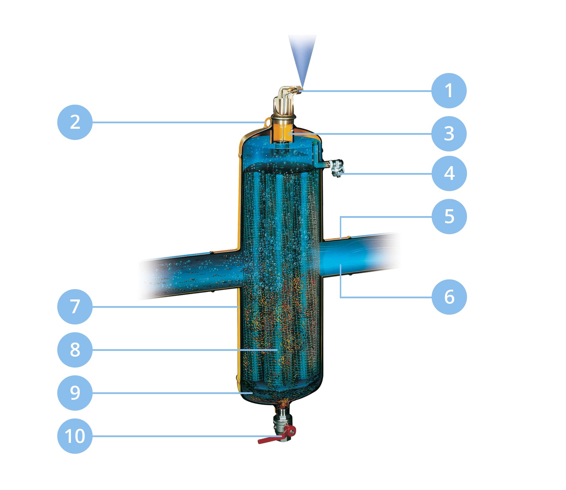 Avlägsnar kontinuerligt fri luft, mikrobubblor och smutspartiklar ur systemvattnet.